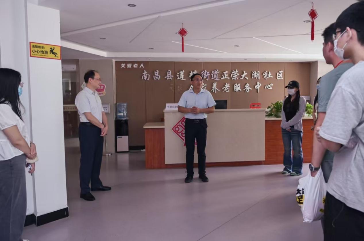 调研首站,师生们来到正荣大湖社区居家养老服务中心,南昌国仁公益服务中心主任黄圣仙向调研团队详细介绍了中心的服务模式。其中,“爱心食堂”作为主要项目内容,曾因运营成本高而面临困境,后在优化管理和经营模式及在南京爱德基金会的支持下,实现了扭亏为盈。为了进一步提升可持续性,提高经营效益的同时完善服务,中心还计划推出面向年轻群体的晚餐小炒服务,以扩大服务覆盖面。黄圣仙强调,尽管面临经营压力,爱心食堂始终坚持公益属性,拒绝个体承包模式,确保服务质量。此外,中心还提供康养护理、适老化改造等服务,全方位满足社区老年人的生活需求。